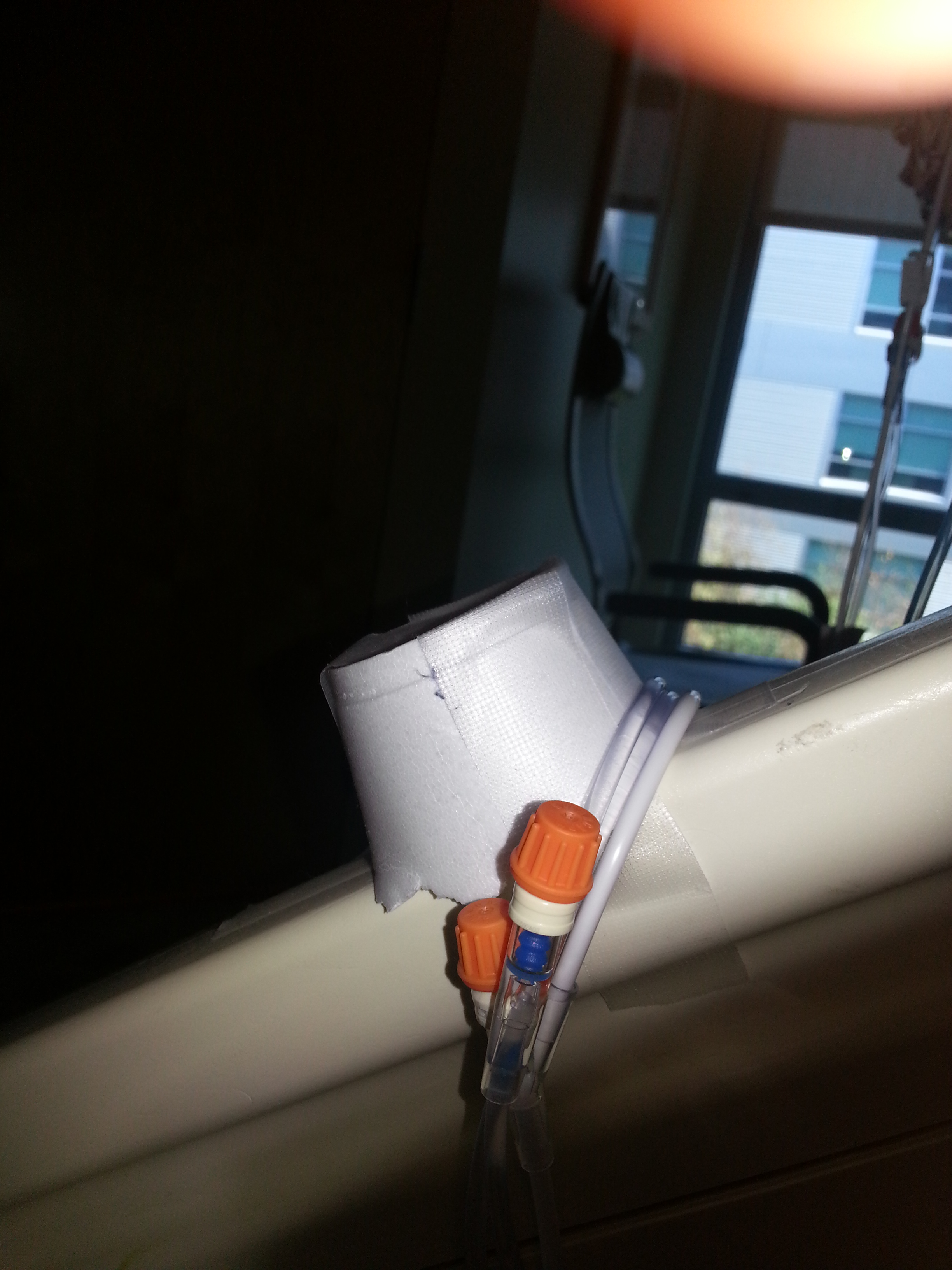 Body: “Using a Styrofoam cup to manage my IV lines over the bed rail. There MUST be a better way!”