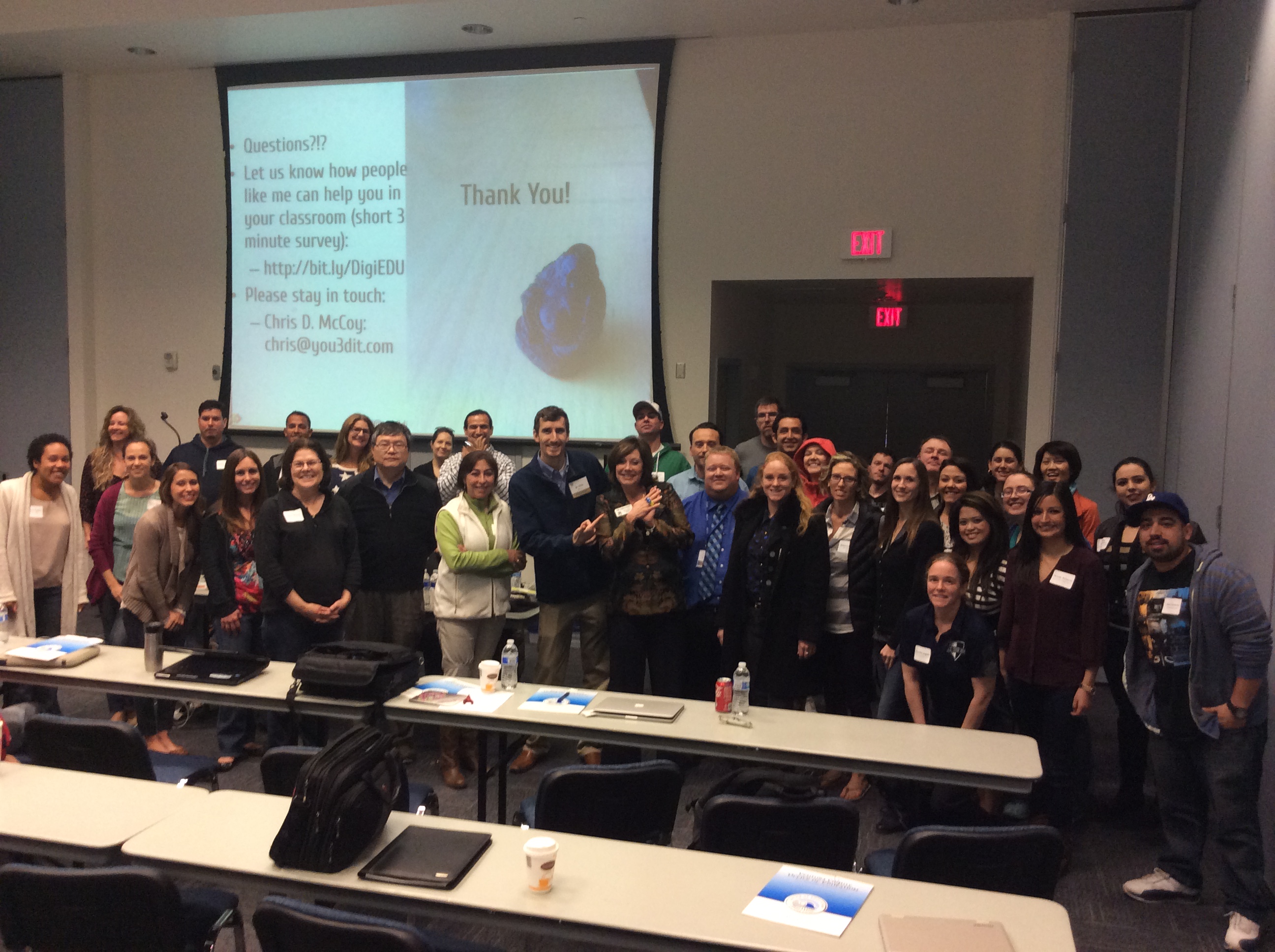 On Saturday, January 24, 2015, Chris had the privilege to present on behalf of You3Dit Inc to the Ventura County Office of Education and their newly credentialed K12 teaching staff. Competing with about 7 other seminars at the same time, we packed Salon B with about 60x educators who were eager to learn more about digital fabrication technologies like 3D printing, laser cutting and desktop CNC.